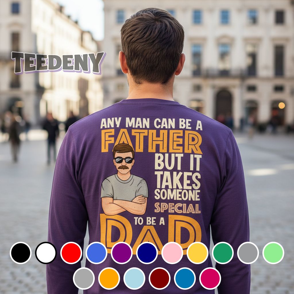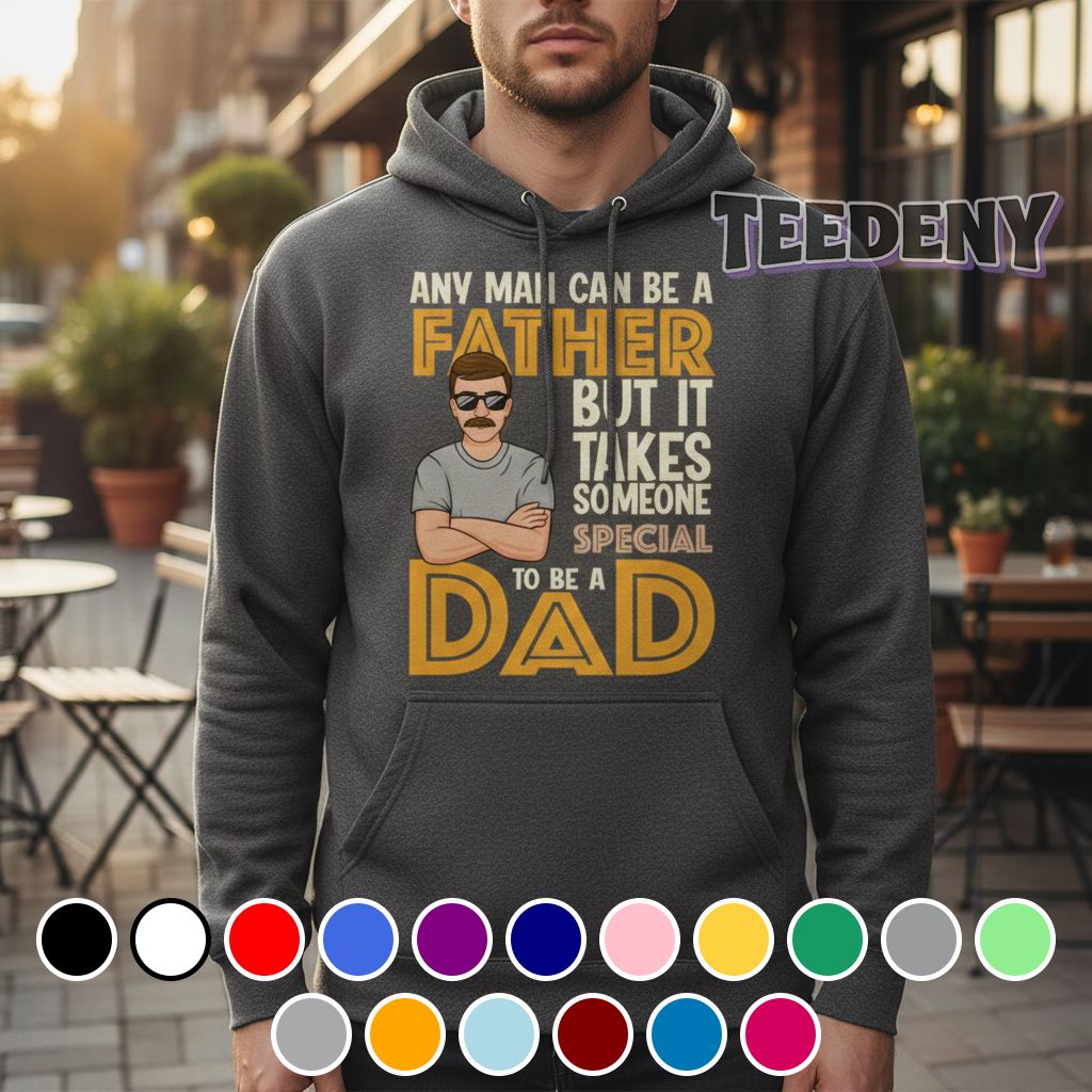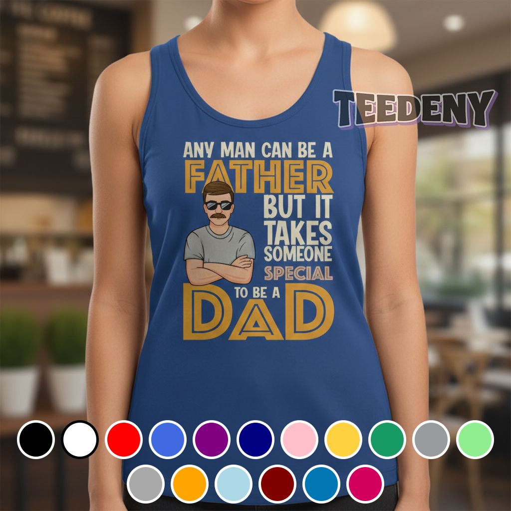 This stylish T-shirt features the phrase “Any Man Can Be A Father But It Takes Someone Special To Be A Dad” prominently displayed across the front, combining a playful yet heartfelt message with eye-catching typography. The text employs a mix of bold and cursive fonts that add visual interest while emphasizing the significance of the sentiment. Set against a backdrop of deep navy blue, the design utilizes bright white and vibrant green accents that create a sharp contrast, making the wording stand out and catch the eye. The arrangement is well-balanced, ensuring that the message flows harmoniously with the shirt’s overall silhouette, inviting wearers to express their pride in a unique way.
