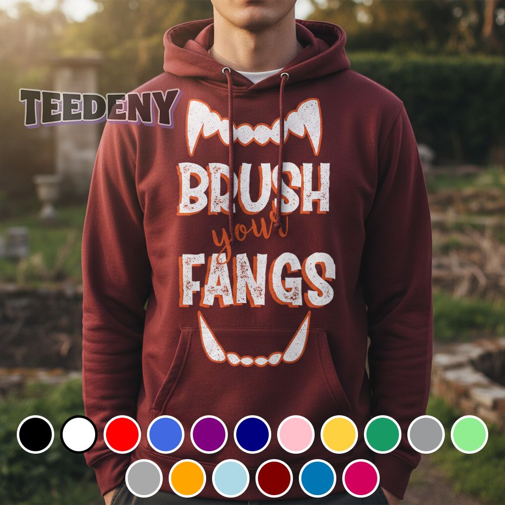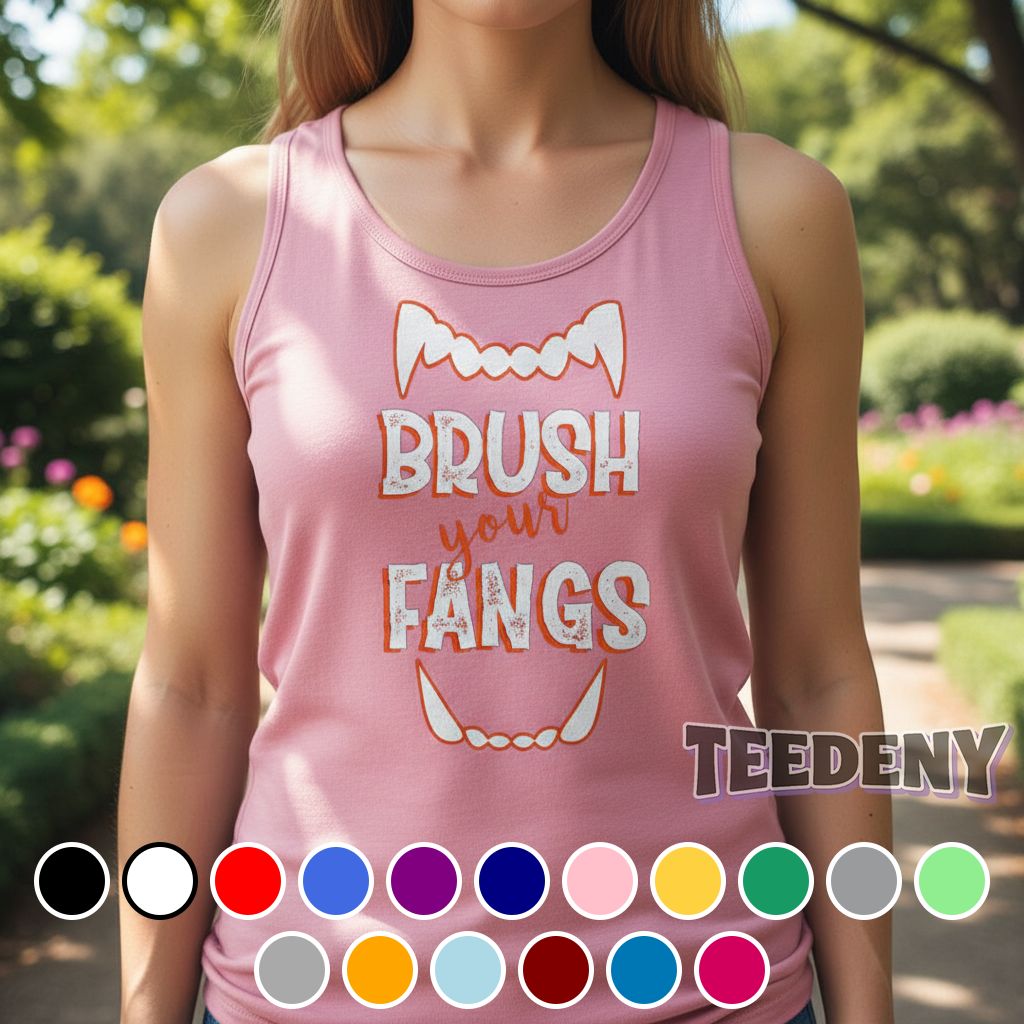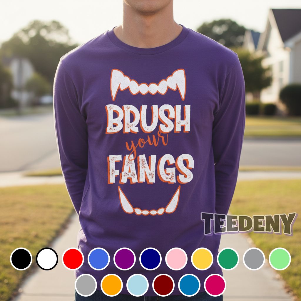 In a striking presentation, the Brush Your Fangs Dental Professional Halloween Shirt showcases a bold graphic design that playfully contrasts traditional Halloween themes with a dental twist. The centerpiece highlights an imaginative rendition of fangs and dental tools, rendered in sharp, vivid colors such as deep orange, bright white, and a touch of eerie green. These elements are set against a classic black background, allowing the colors to pop and catch the eye. The typography incorporates a quirky, handwritten-style font that swirls around the main design, enhancing the playful aesthetic and adding depth to the overall composition.