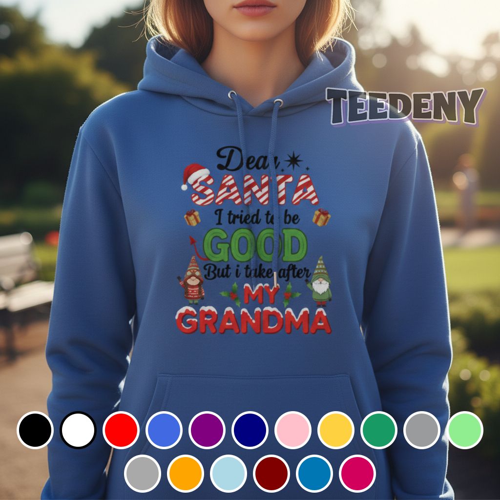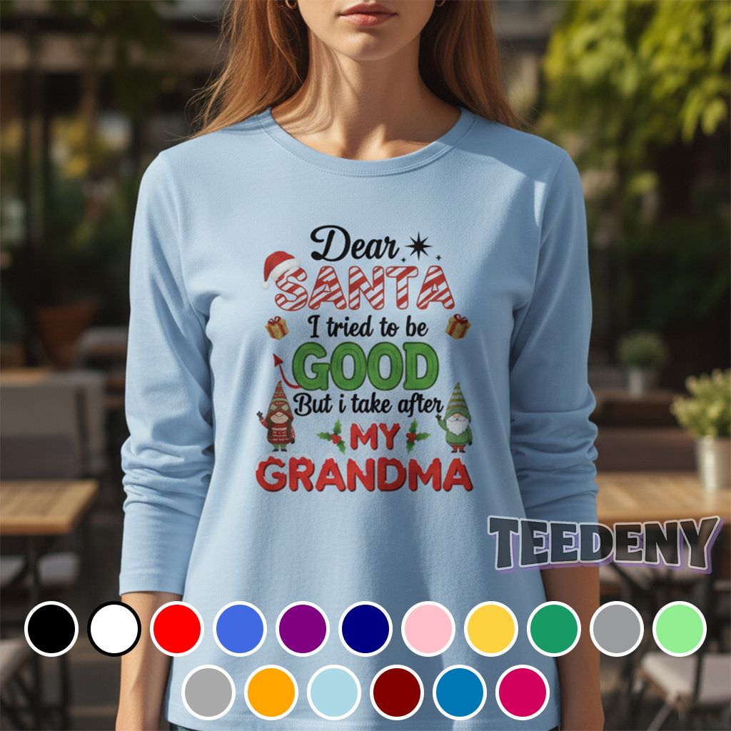 A charming T-Shirt featuring the phrase “Dear Santa I Tried To Be Good But I Take After My Grandma,” this design unfolds with playful typography that flows smoothly across the chest. The contrasting colors of deep red and crisp white create a striking visual appeal, drawing attention while maintaining a whimsical vibe. The text is emphasized with dynamic curves, reflecting a festive spirit that seamlessly interacts with the garment. Additional design elements, such as subtle icons or festive motifs, may enhance the overall layout, contributing to a cheerful atmosphere suitable for various occasions.