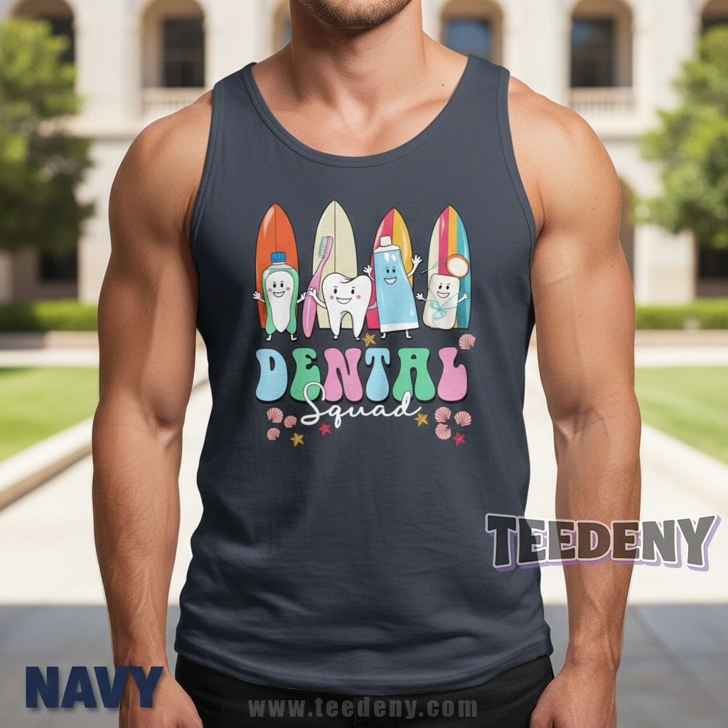 Sun, surf, and smiles come together in this Dental Squad Summer Surfboard Beach Vacation Shirt from Teedeny. Designed for dental professionals who love a little coastal energy, this playful graphic tee features cheerful dental characters lined up with colorful surfboards, bringing a lighthearted beach vibe to your everyday uniform rotation.