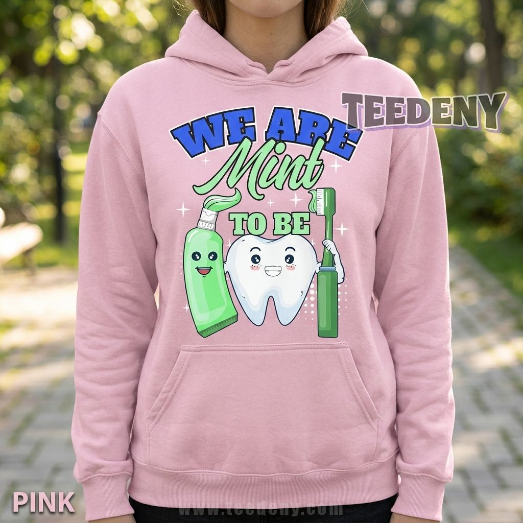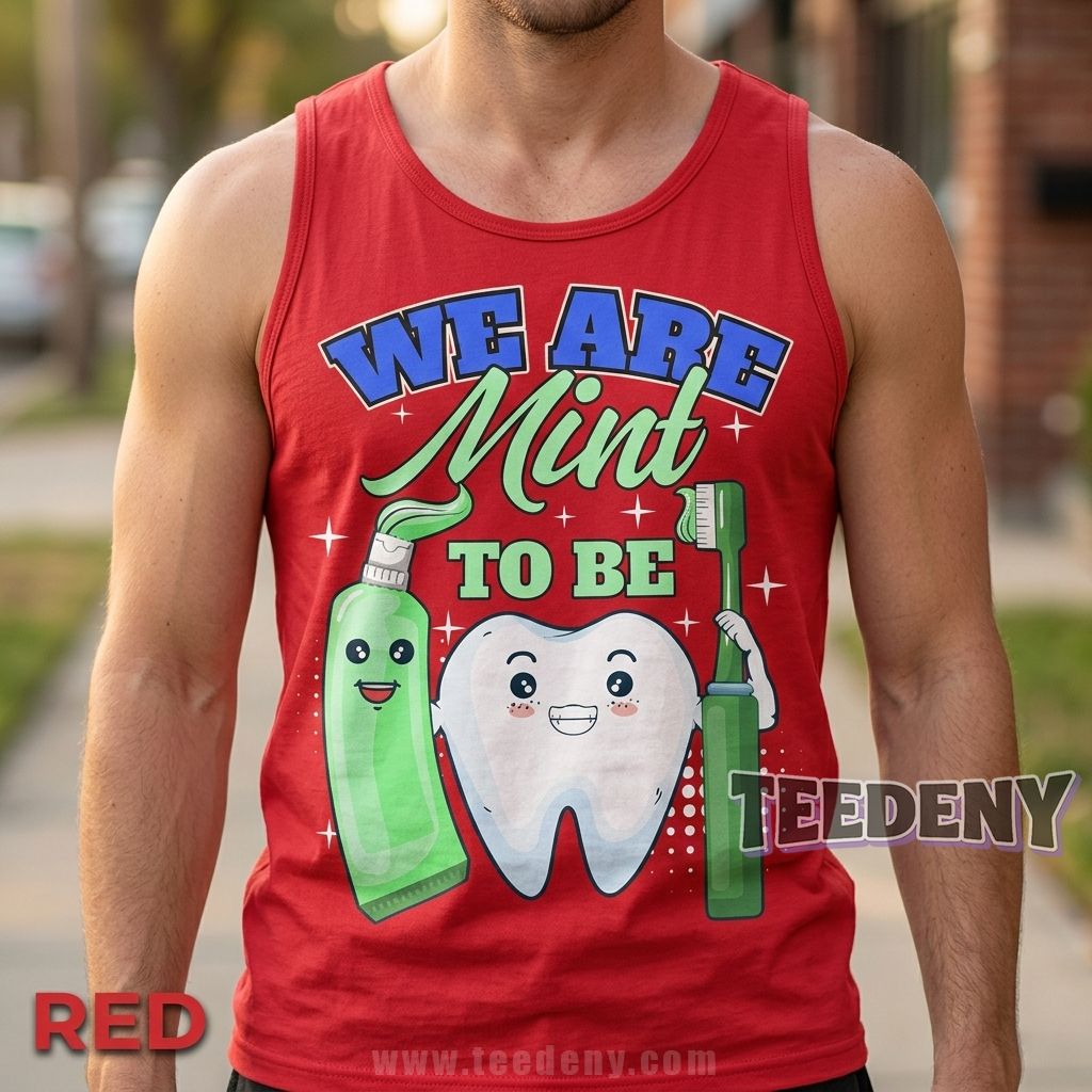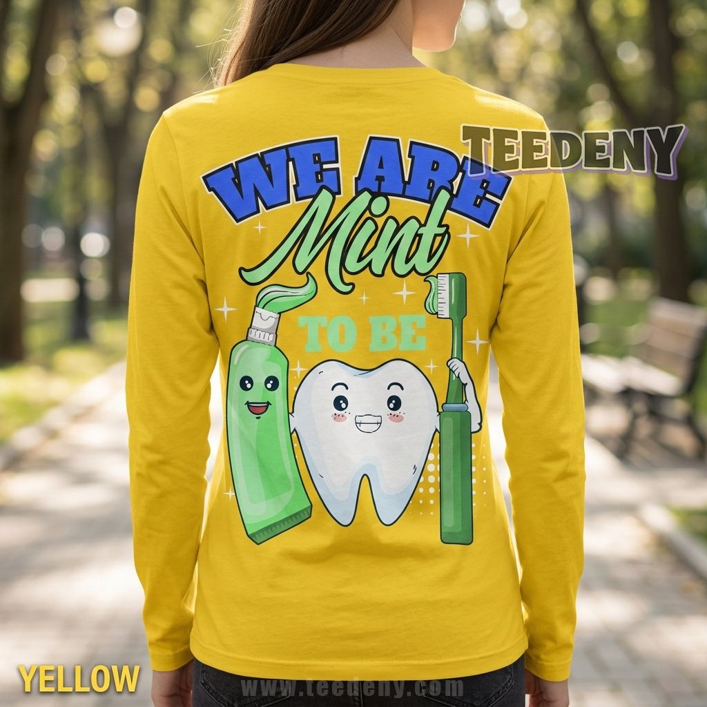 Bring a little humor to the dental world with this Funny Dental Pun Shirt We Are Mint To Be For Hygienists, a playful graphic tee designed for professionals who keep smiles fresh every day. Featuring an adorable tooth character alongside mint toothpaste and a toothbrush, the design turns a clever wordplay into a cheerful statement piece that instantly connects with fellow dental pros.