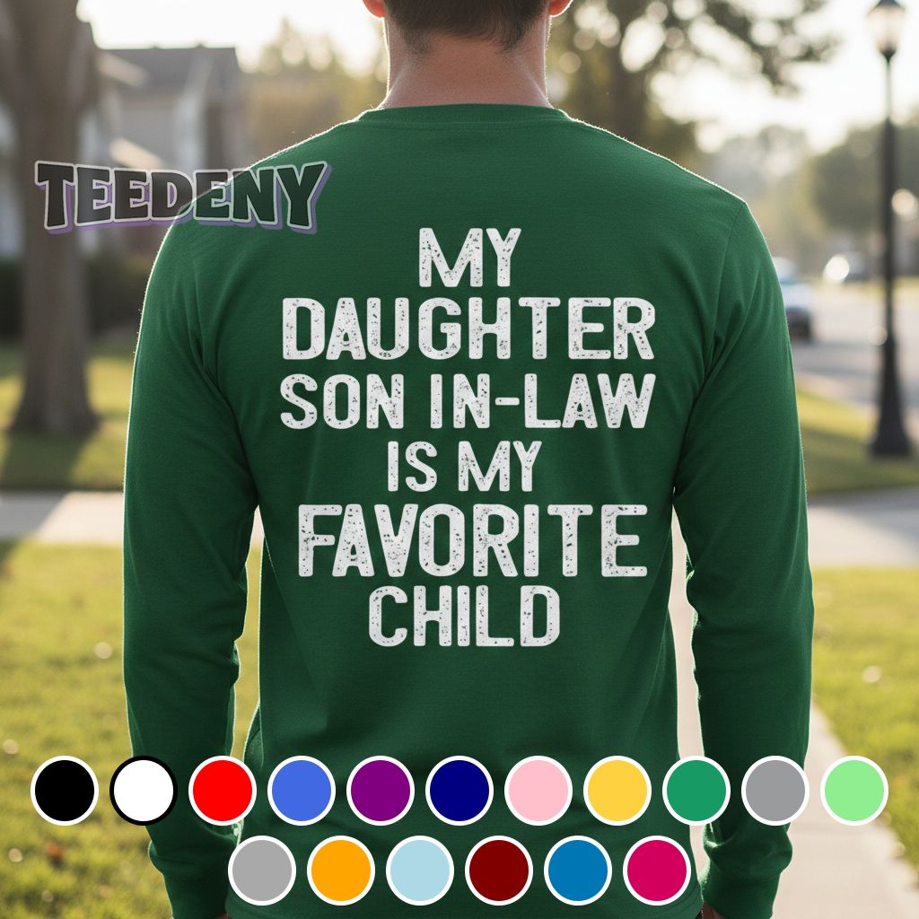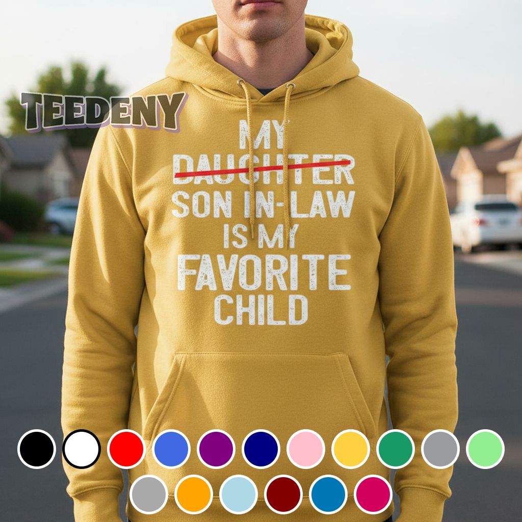 Embodying a lighthearted spirit, the Funny My Son In Law Is My Favorite Child Shirt presents an inviting design that captures attention with its playful message. The layout features prominent, bold typography, expressing the cheeky sentiment in a stylish font that contrasts beautifully against the base color of the shirt. The main text stands out in a vibrant hue, while secondary accents harmoniously complement the overall palette, creating a whimsical appearance. Graphics might branch across the fabric with a creative balance, emphasizing the focal message while allowing for an open and breathable feel across the garment.