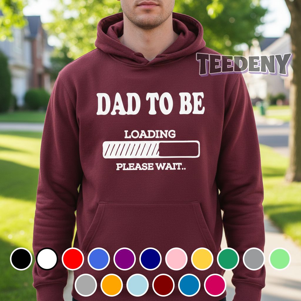 The Funny New Dad To Be Loading Please Wait Shirt showcases a playful design that resonates with the excitement of impending fatherhood. Featuring a classic T-shirt silhouette, the artwork is prominently displayed across the front, where the phrase “Loading Please Wait” is highlighted in bold, humorous typography. The graphic utilizes a blend of vibrant hues, with cheerful blue complementing a light, eye-catching yellow. The text contrasts effortlessly against the shirt’s base color, creating a lighthearted ambiance while engaging the viewer’s attention on the clever messaging.