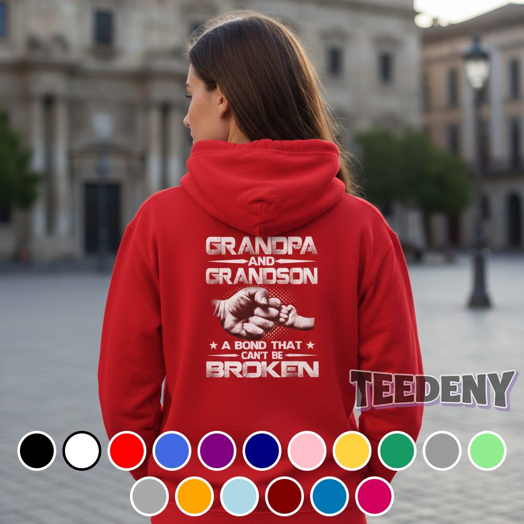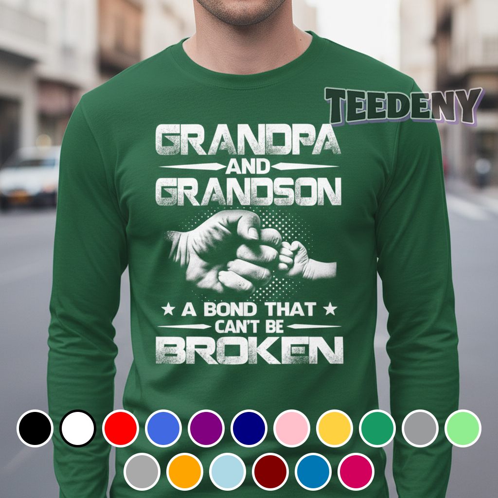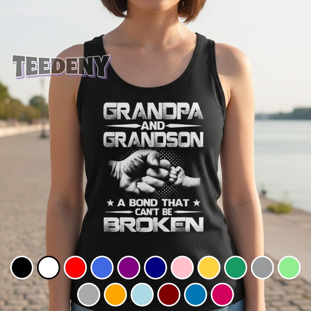 The Grandpa And Grandson A Bond That Cant Be Broken Gift Shirt presents an engaging visual tapestry that speaks to the unique bond between generations. Featuring playful illustrations in a charming layout, the graphics showcase a whimsical depiction of a grandfather and grandson in a heartfelt embrace, centered on the front of this classic T-shirt. The typography complements the imagery with a bold, friendly font that adds warmth to the overall design, all set against a soft backdrop. Dominant hues of navy blue intertwine with bright accents of yellow and orange, creating a vibrant contrast that draws the eye without overwhelming the viewer.
