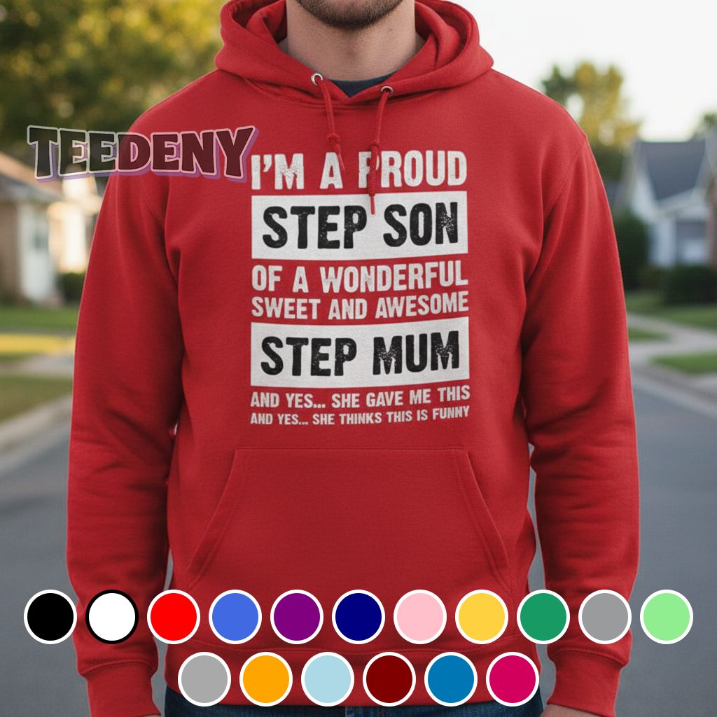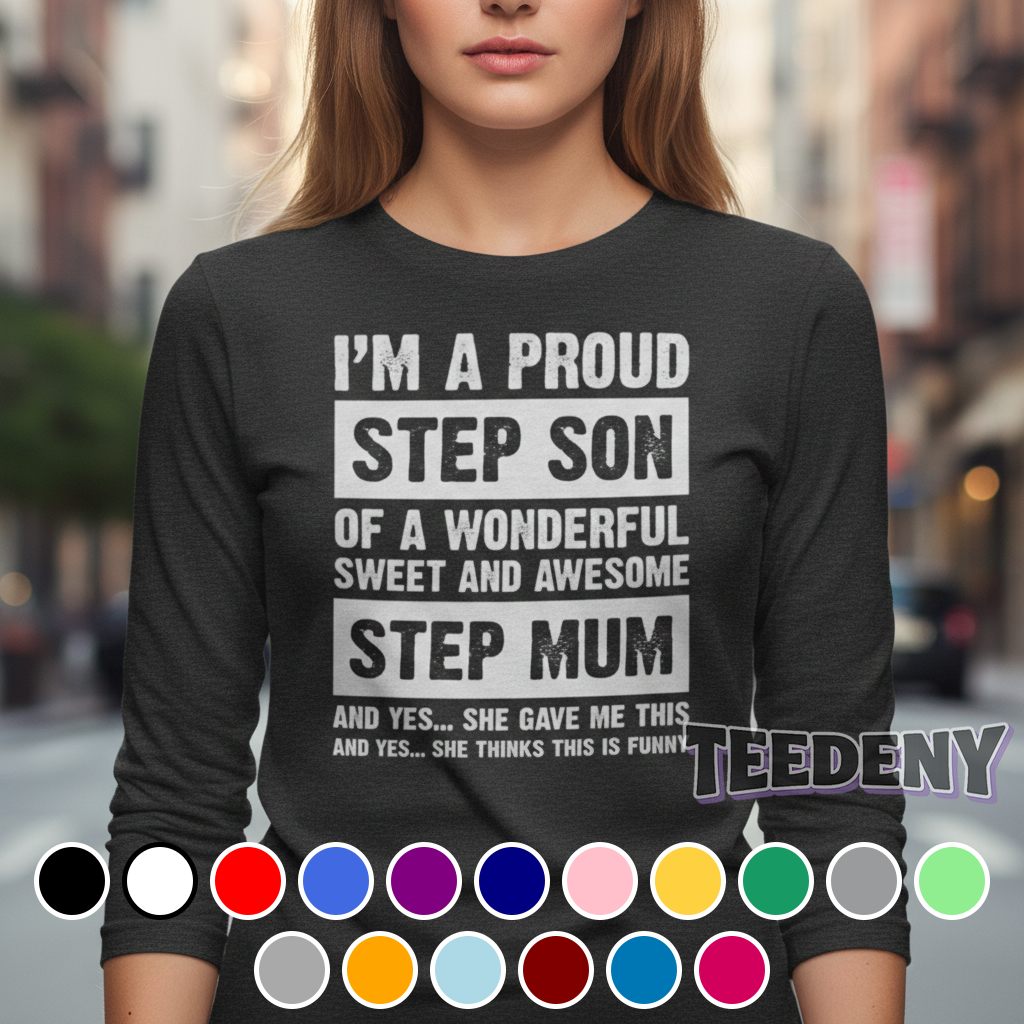 Embodying a casual yet thoughtful style, the I Am A Proud Stepson Of A Wonderful Sweet Awesome Stepmum Shirt presents a striking visual identity. The design prominently showcases bold, expressive typography that serves as the centerpiece, elegantly cascading across the front of the garment. The letters are adorned in a rich palette of warm hues, combining vibrant shades of blue and yellow that create a bright contrast against the fabric’s backdrop, enhancing readability and visual impact. Subtle decorative elements, such as soft lines and gentle curves, frame the text, adding to the overall cohesion without overwhelming the primary message.