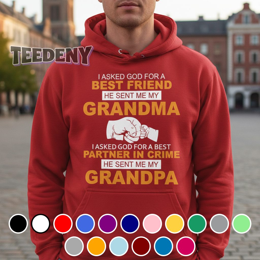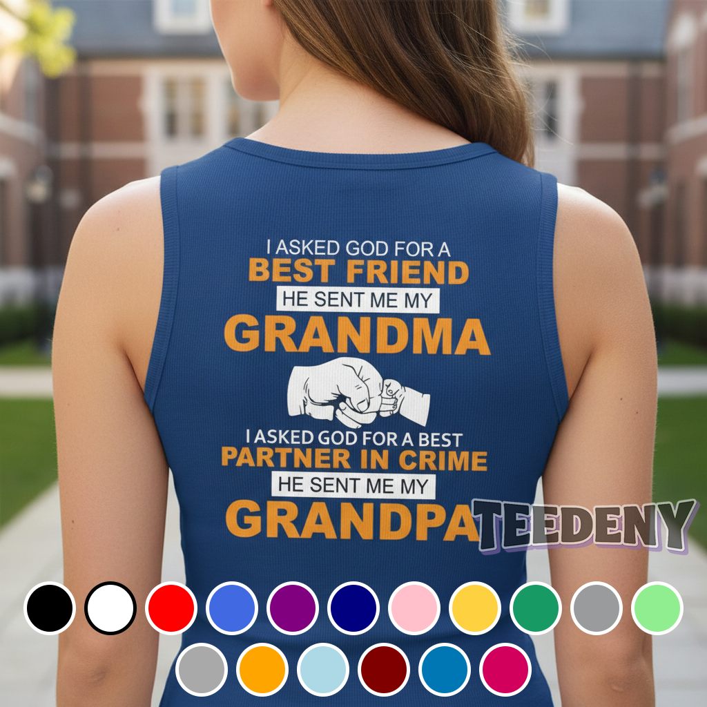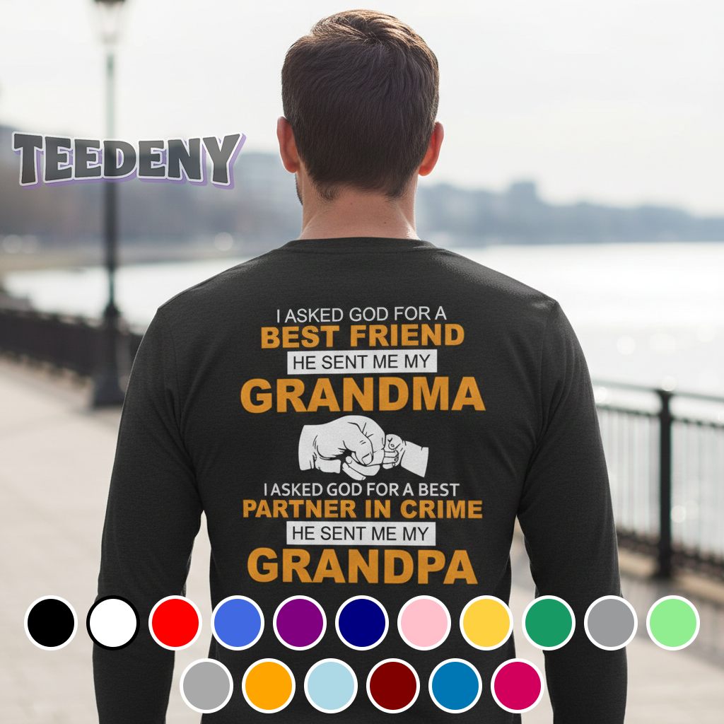 A playful spin on family connections adorns this T-shirt, showcasing the sentiment that resonates with many. Centered prominently on the front, the phrase “I Asked God For A Best Friend He Sent Me My Grandma Grandpa” stands out in a cheerful, bold typography that combines warm, earthy tones with splashes of vibrant colors. Balanced against a soft backdrop, this design features whimsical accents and subtle graphics that symbolize unity and love, inviting a lighthearted vibe as it wraps around the torso, ensuring an eye-catching experience from all angles.