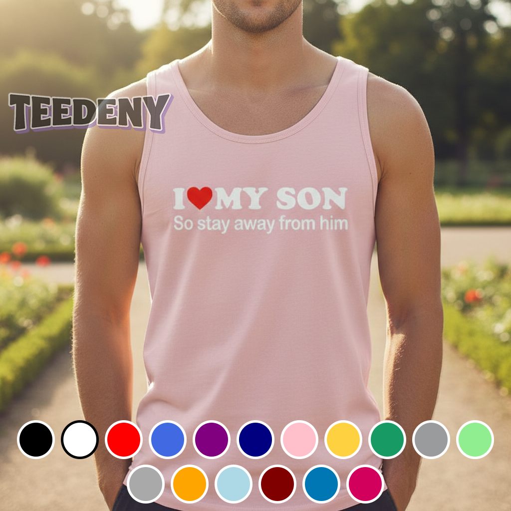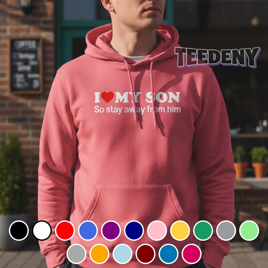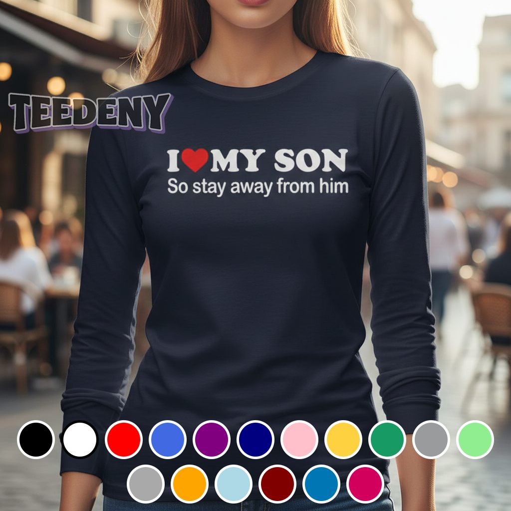 Boldly presenting a unique statement, the I Love My Son So Stay Away From Him Shirt stands out with its playful design. Featuring a prominent heart graphic that serves as the focal point, the typography is integrated seamlessly, creating a striking contrast against the backdrop. The lettering is designed in a cheerful, eye-catching style, utilizing vibrant hues like reds and whites to amplify its message. Subtle shadowing adds depth, while the artistic layout draws the eye across the full expanse of the shirt, ensuring the declaration is clear from every angle.