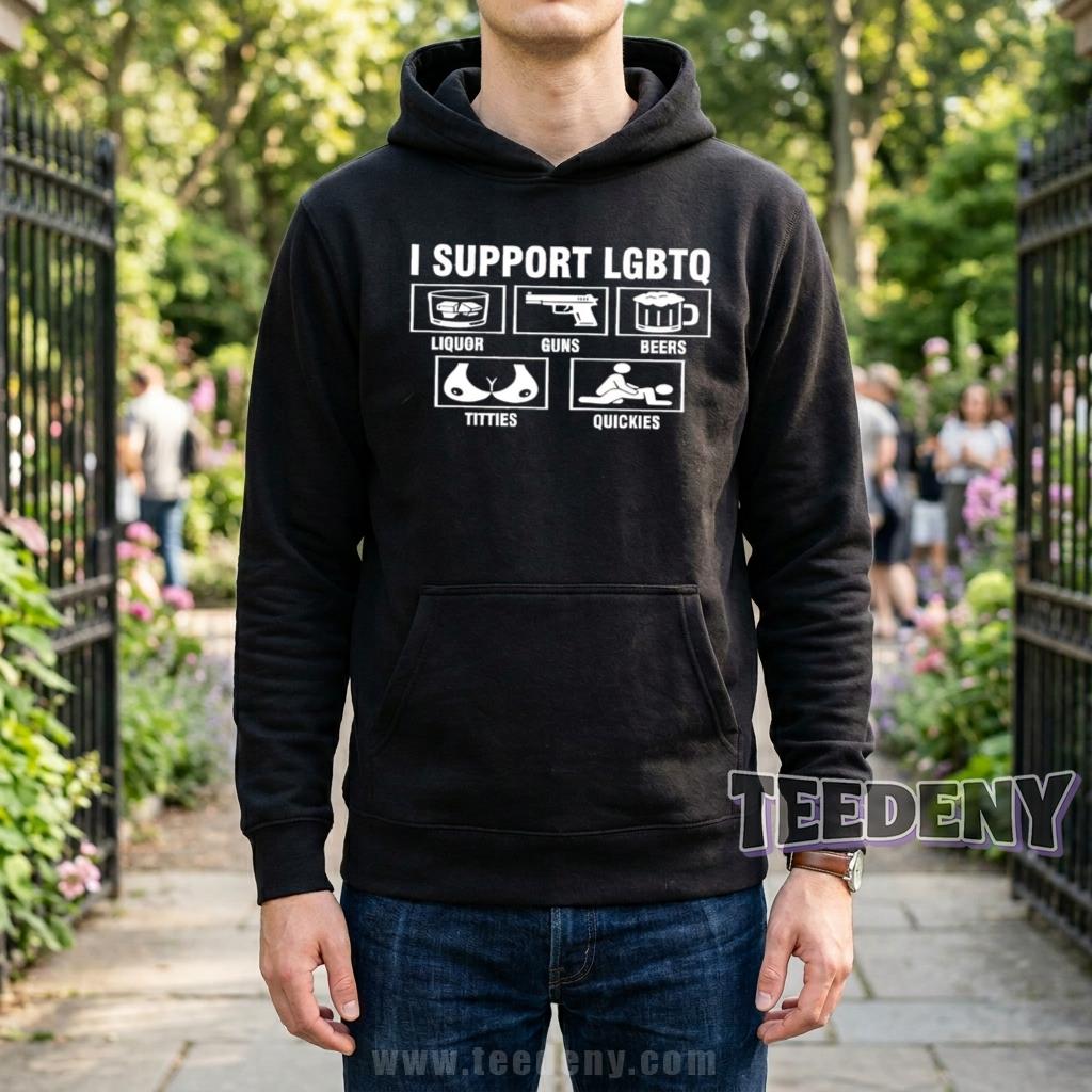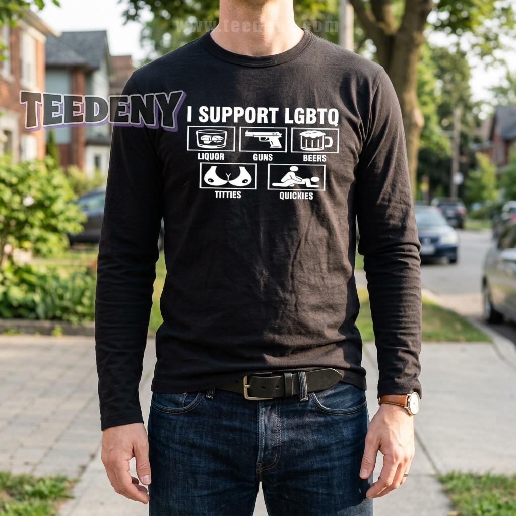 Those who appreciate a good laugh and aren’t afraid to challenge norms will find their new favorite tee in this playful design. The I Support LGBTQ Liquor Guns Beers Titties Quickies Shirt by Teedeny blends irreverence with humor, creating a standout piece that makes a statement about acceptance and fun. This unique parody shirt is crafted for those who thrive in social situations and enjoy a cheeky twist on traditional themes.