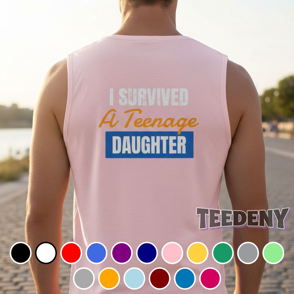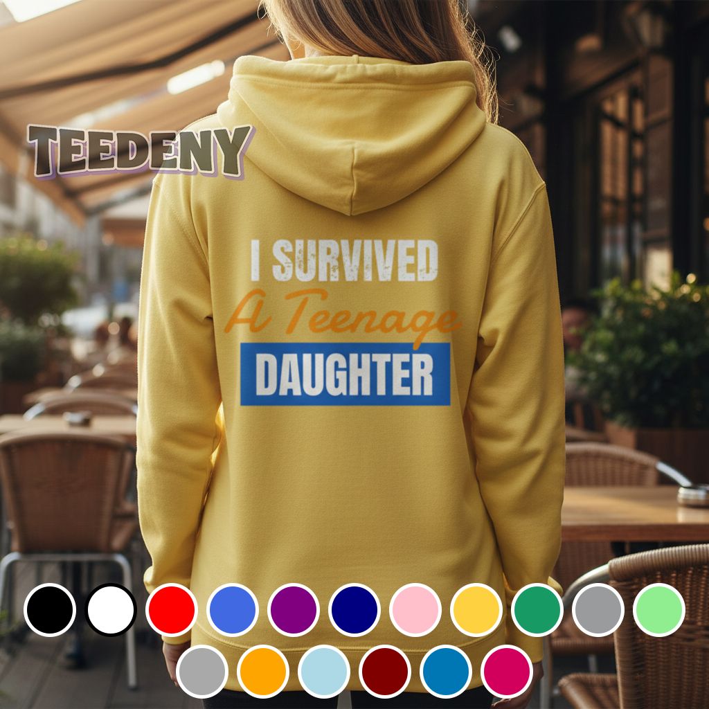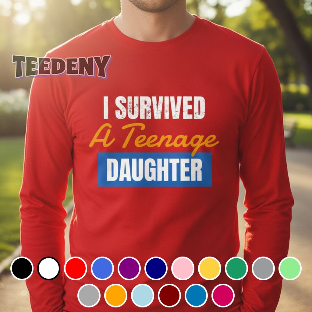 The I Survived A Teenage Daughter Humorous Mom Gift Shirt captures attention with its playful design, presenting a bold statement that resonates with parents navigating the teenage years. Centered on the front, the eye-catching typography bursts forth in a lively mix of vibrant colors, predominantly featuring shades of fun and energy against a contrasting backdrop. The arrangement of the text is both whimsical and assertive, adding a lighthearted touch to the overall aesthetic. Various graphic elements intertwine with the words, enhancing the visual narrative and enriching the garment’s surface without overwhelming the central message.