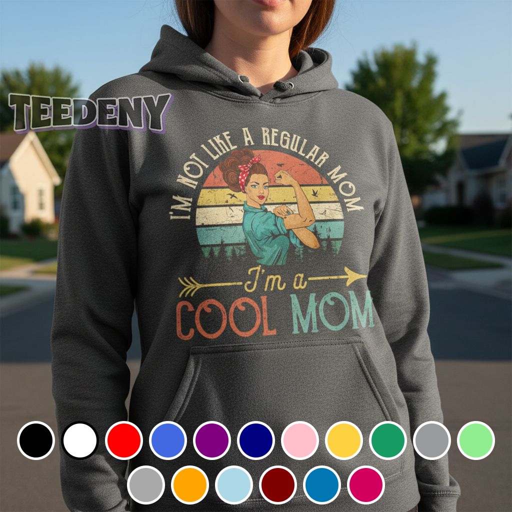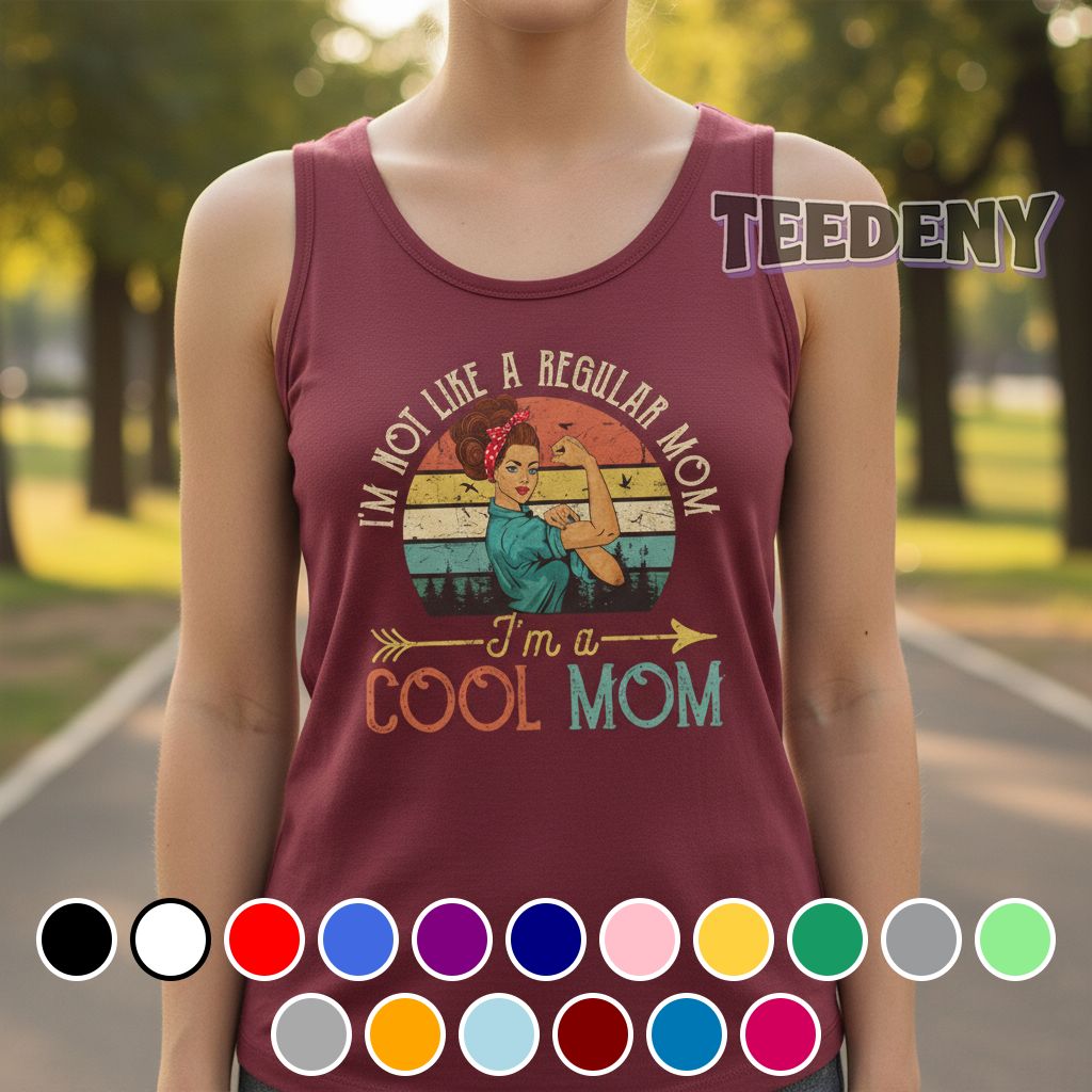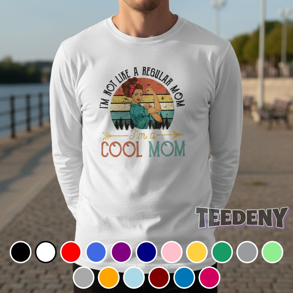 Boldly presenting the essence of a playful spirit, the I’m Not Like A Regular Mom I’m A Cool Mom Retro Shirt showcases a captivating design that merges nostalgic charm with contemporary flair. The primary graphic features bold, playful typography set against a vintage-inspired backdrop, creating a visually striking presentation at the center of the shirt. Hues of soft pastels intermix with vibrant tones, crafting a perfect contrast that elevates the message while maintaining a cohesive look. The graphics flow seamlessly across the fabric, inviting attention without overwhelming the overall aesthetic, making it a standout piece for any casual ensemble.