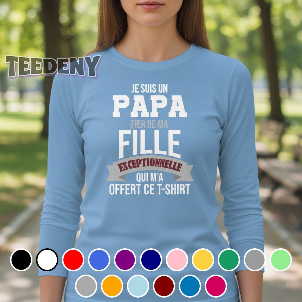 A striking addition to the world of casual wear, the Je Suis Un Papa Fier De Ma Fille Exceptionnelle Father Shirt features a lively and engaging design spread prominently across its front. Bold, eye-catching typography expresses a joyful sentiment, layered with playful graphics that embody pride and love. Deep shades of navy blue provide a rich backdrop, while vibrant accents in white or light green punctuate the message, creating a strong visual contrast that grabs attention. The artwork embraces the space effectively, making for an appealing focal point that invites a closer look.