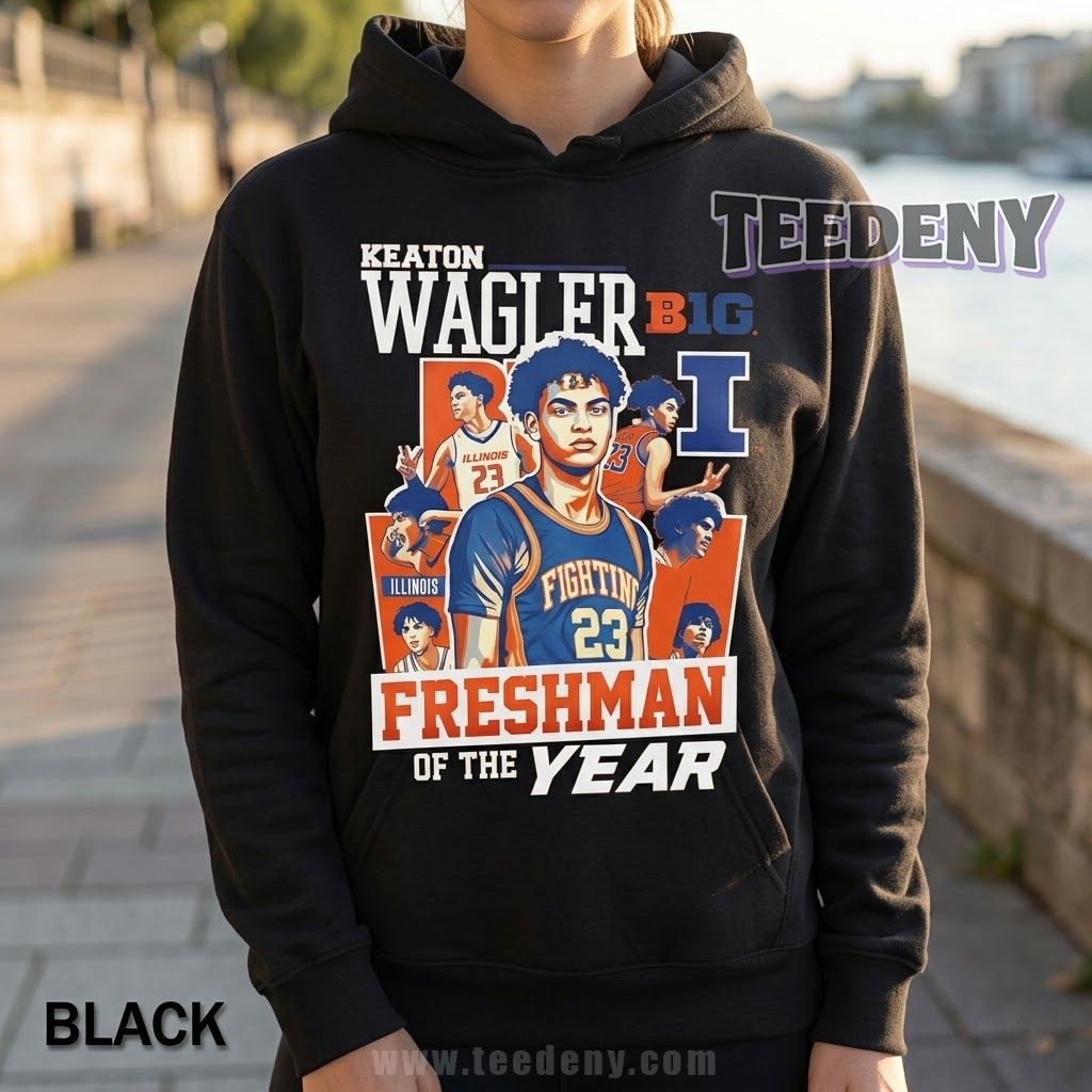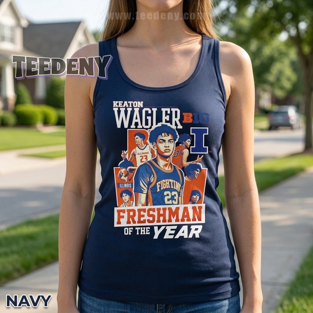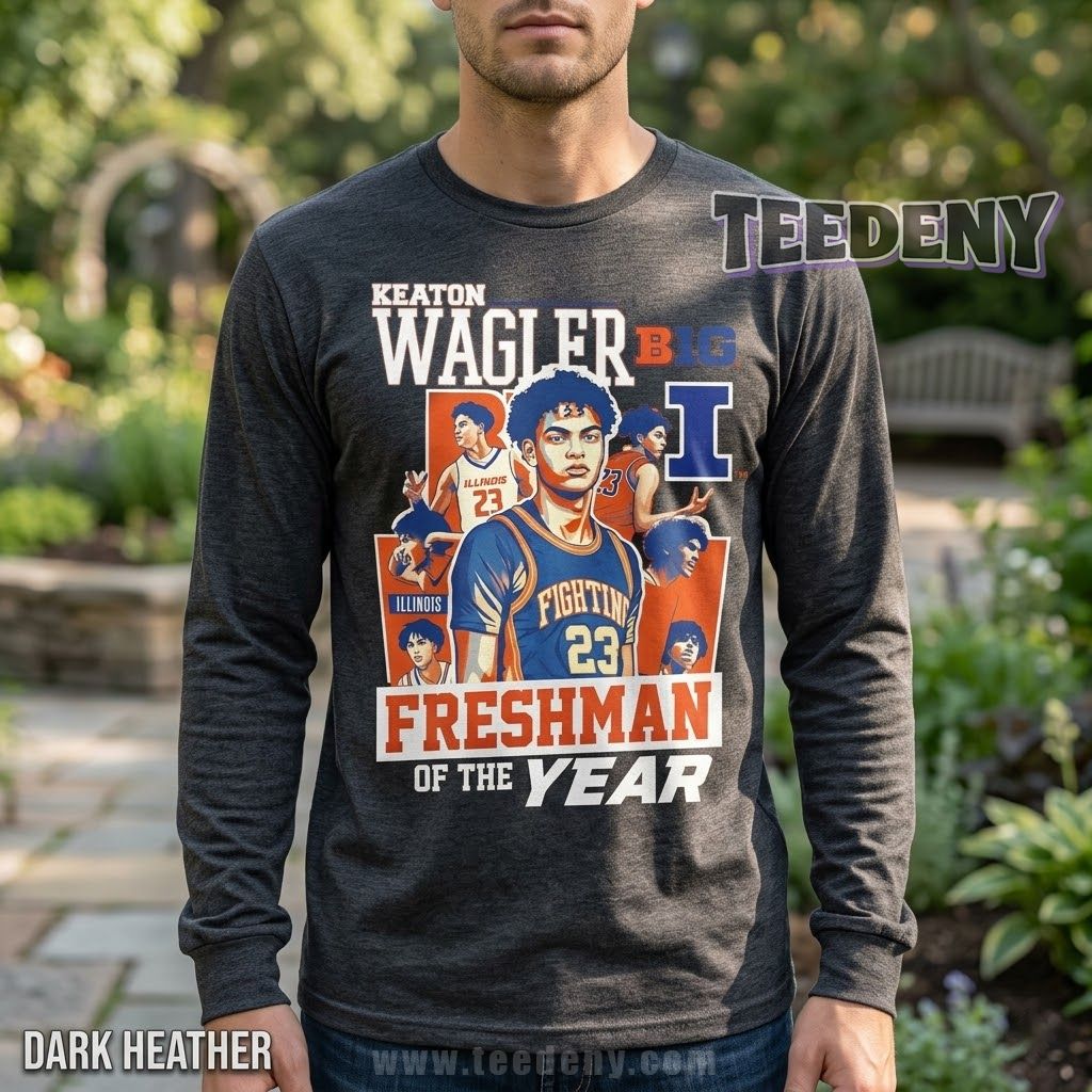 Supporters of rising stars in college basketball will find a must-have piece with this uniquely designed T-shirt. The Keaton Wagler #23 Illinois Fighting Illini Big Ten Freshman Of The Year T-Shirt embraces the spirit of campus pride, seamlessly blending the excitement of the game with a tribute to a promising player. This shirt stands out not only for its tribute to Keaton Wagler but also for its comfortable design that lets you cheer on your favorite team in style.