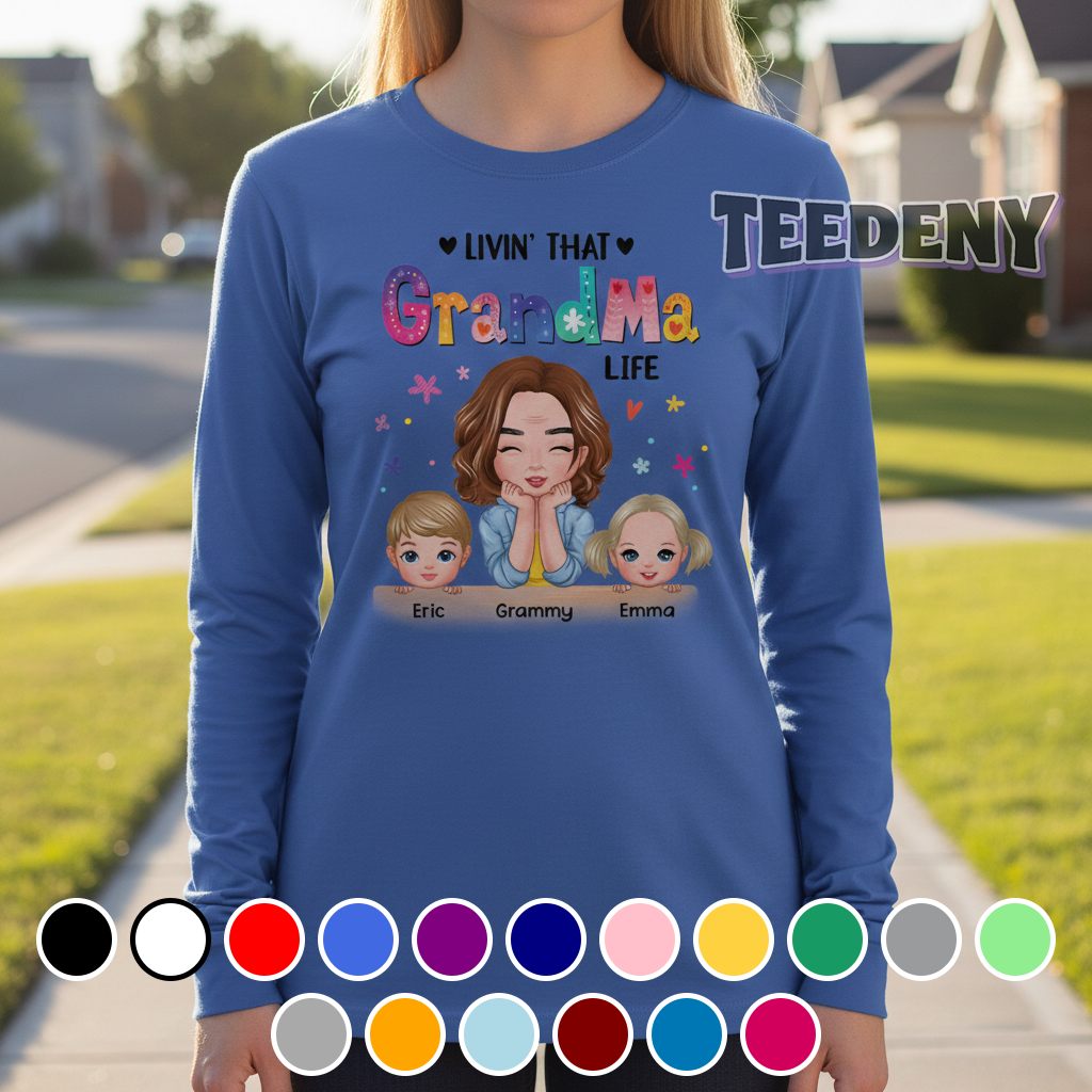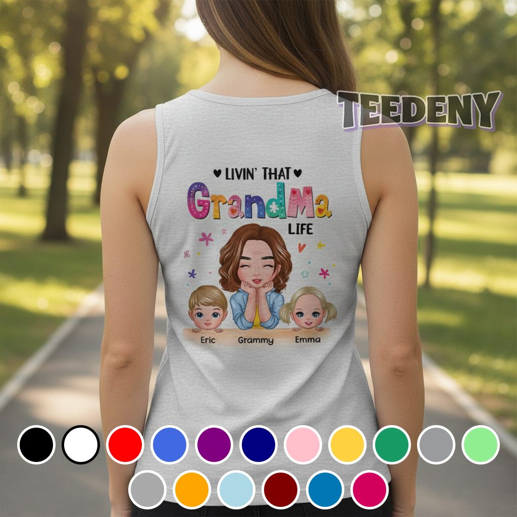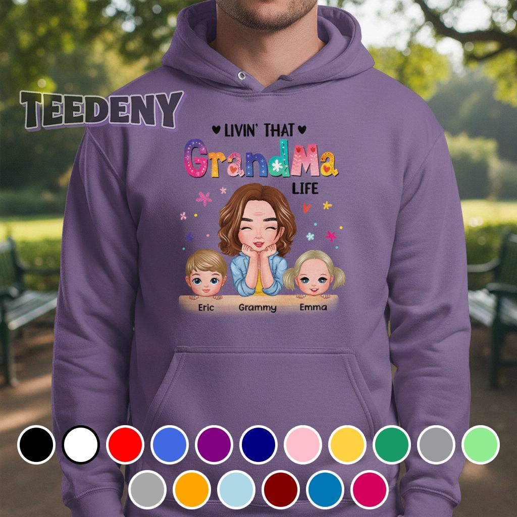 Embracing a cozy yet vibrant aesthetic, this colorful custom names grandma shirt features a lively arrangement of graphics that tells a joyful story. Eye-catching typography sprawls across the front, showcasing cheerful, stylized lettering intertwined with whimsical motifs. The palette bursts with bold hues of pinks, yellows, and greens, creating a delightful contrast against a neutral base that allows the design to pop. Each detail is positioned thoughtfully, enhancing the visual appeal while ensuring a sense of balance throughout the piece, appealing to those who cherish family-centered themes.
