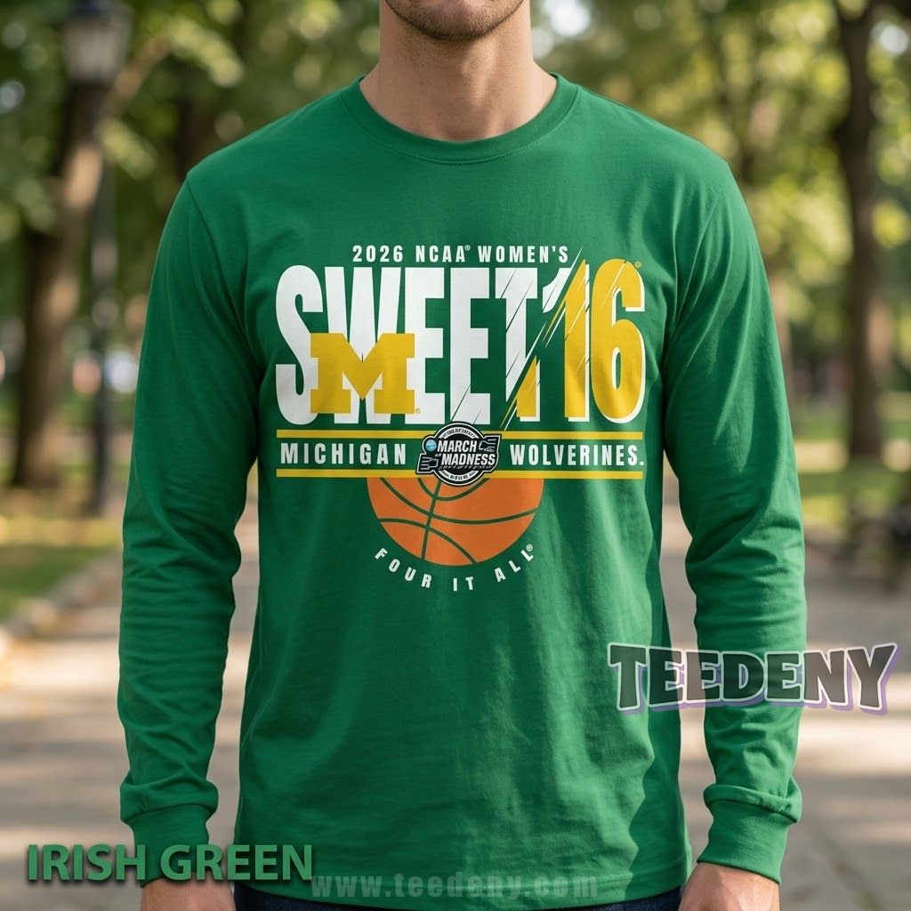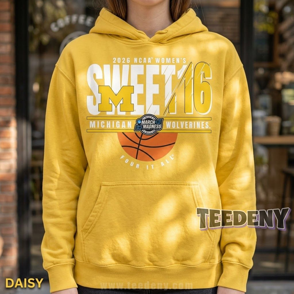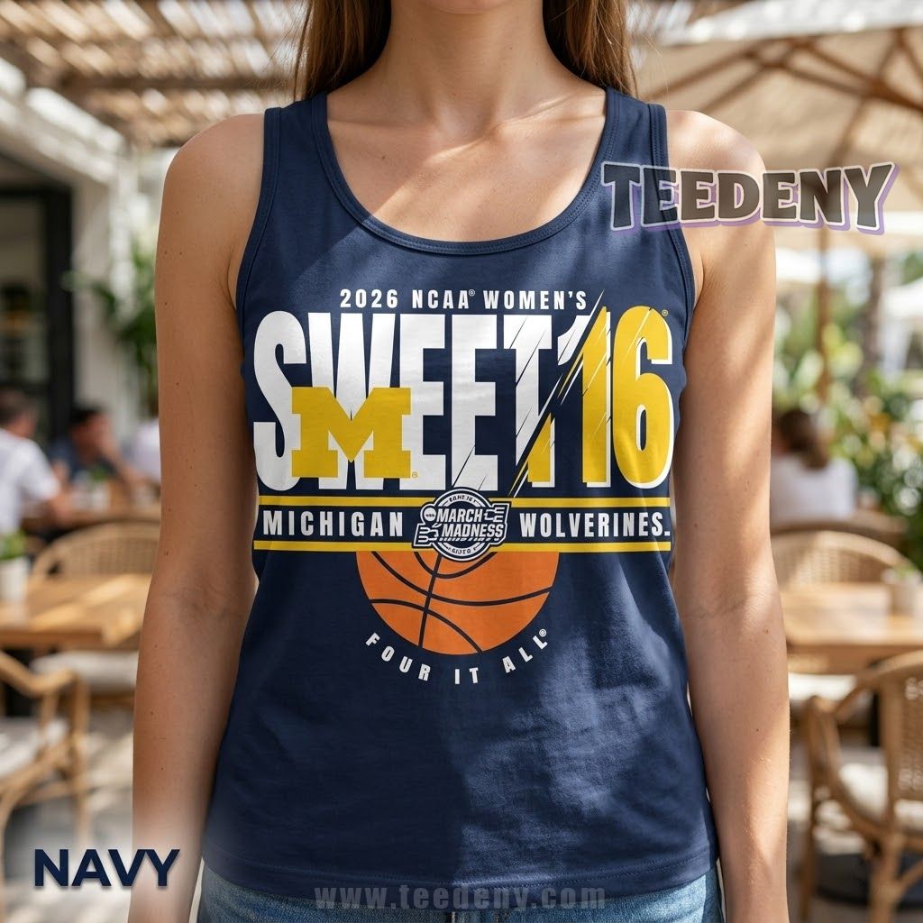 Women who are passionate about basketball and excited for the thrill of March Madness finally have a T-shirt that truly reflects their spirit. The Michigan Wolverines Women’s Basketball Sweet 16 2026 March Madness Game T-Shirt effortlessly merges team pride with the electrifying atmosphere of tournament season. The design captures the essence of March Madness, making it the perfect piece to wear as you cheer your team to victory.