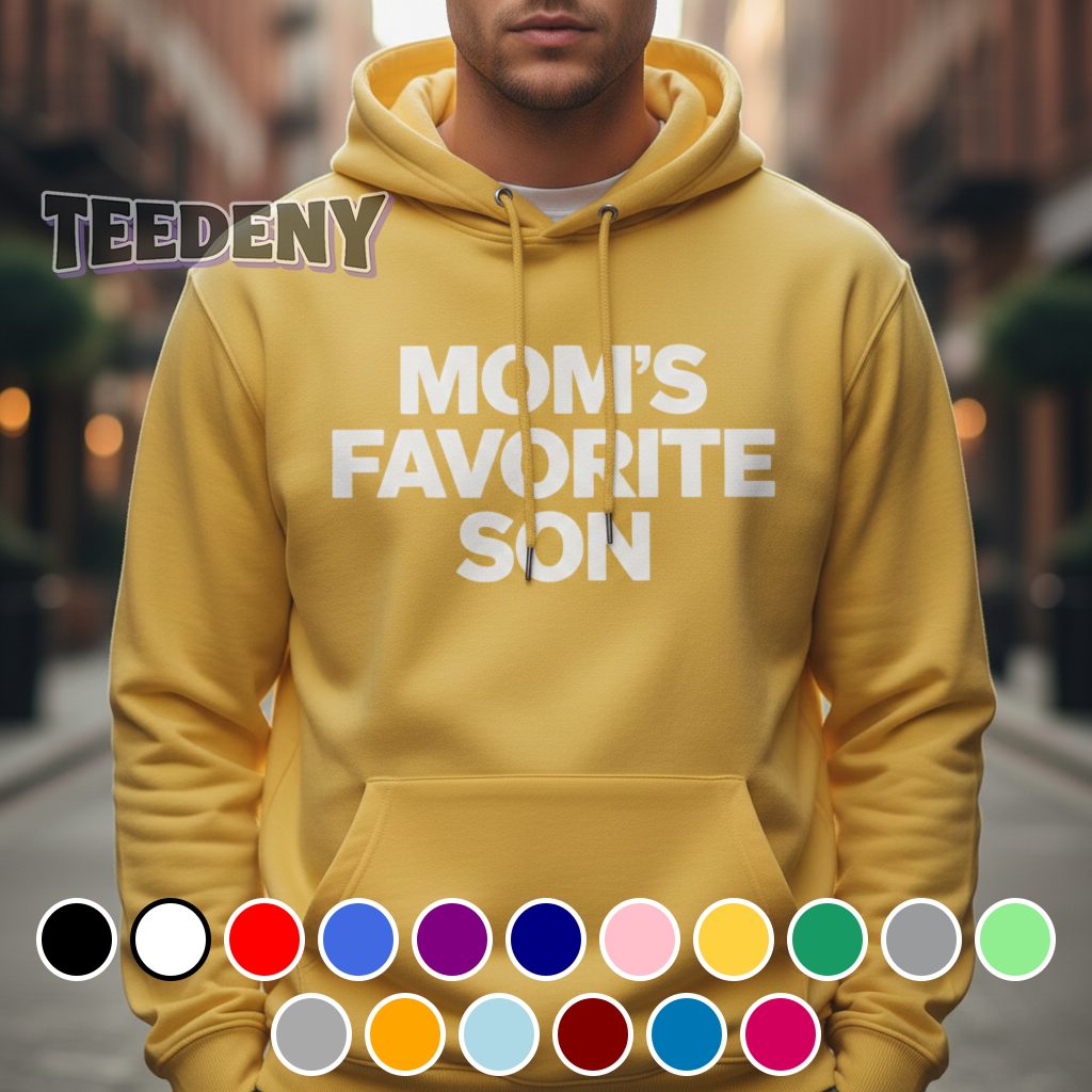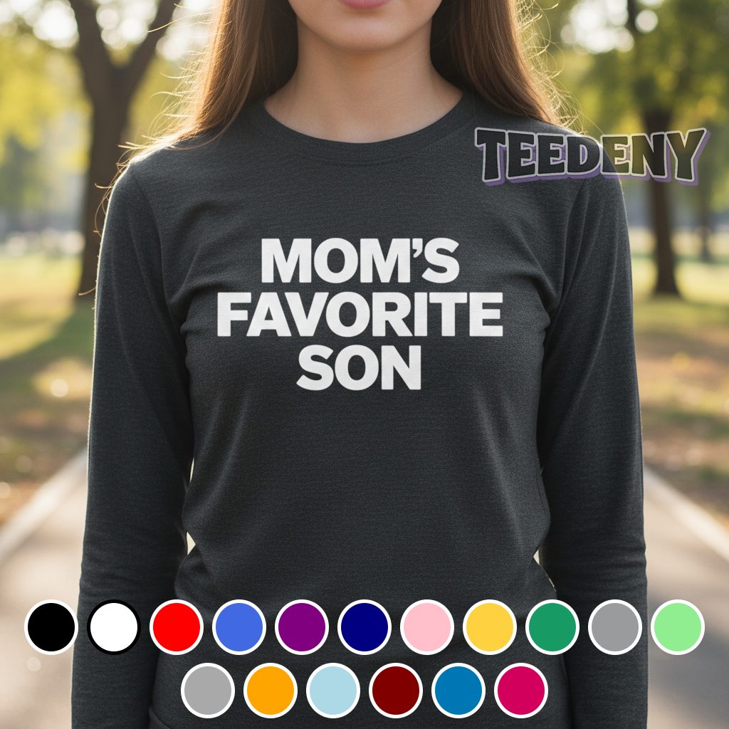 Crafted into a playful T-Shirt, the Mom’s Favorite Son Funny Quote Shirt prominently features a cheeky typography design, centered across the chest in an engaging and spirited font. The playful phrase embraces a spectrum of colors, highlighted with soft pastels intermingled with deeper tones for contrast. The layout of the text flows smoothly, creating an inviting visual rhythm that invites onlookers to join in the humor. Subtle embellishments may include decorative elements that complement the text, adding depth and dimension to the overall appearance without overwhelming the main message.