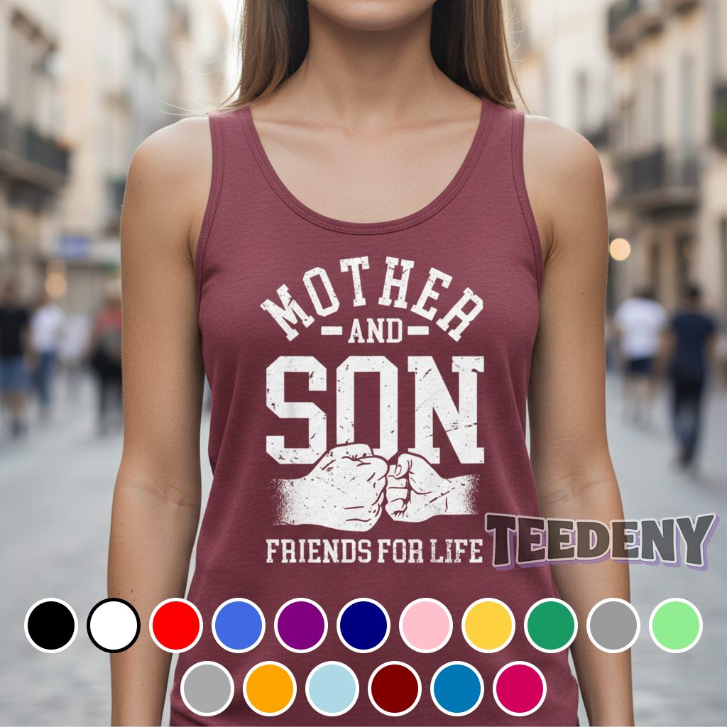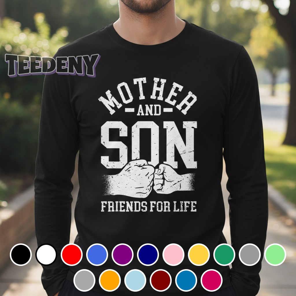 Featuring a vibrant design, the Mother And Son Friends For Life Funny Fist Bump Graphic Shirt presents a striking visual statement perfect for casual outings or family gatherings. Centered on the front, the playful fist bump graphic captures an endearing moment of connection, radiating warmth and humor. The design is executed in a mix of bright, cheerful colors, prominently showcasing shades of blue and yellow that contrast beautifully against the shirt’s background. The creative typography adds a distinctive charm, playfully wrapping around the artwork to enhance the overall composition without overwhelming the central imagery.