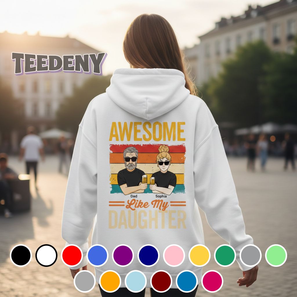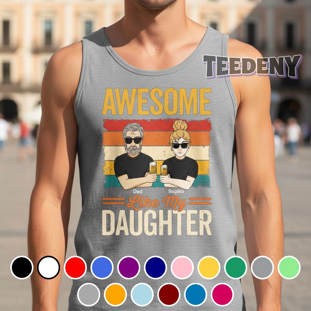In a striking T-shirt design, the Personalized Awesome Father Like My Daughter Gift Shirt features a clever arrangement of playful typography and vivid graphics that celebrate the bond between fathers and daughters. The statement showcases a mix of complementary colors, with deep blues and warmer earth tones creating a harmonious contrast. Eye-catching motifs, including stylized hearts and playful icons, surround the central text, spreading out organically across the fabric to form a dynamic yet balanced composition. The graphics exemplify an all-over print approach, wrapping around the shirt to deliver a seamless visual experience.