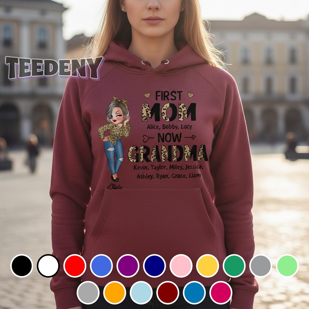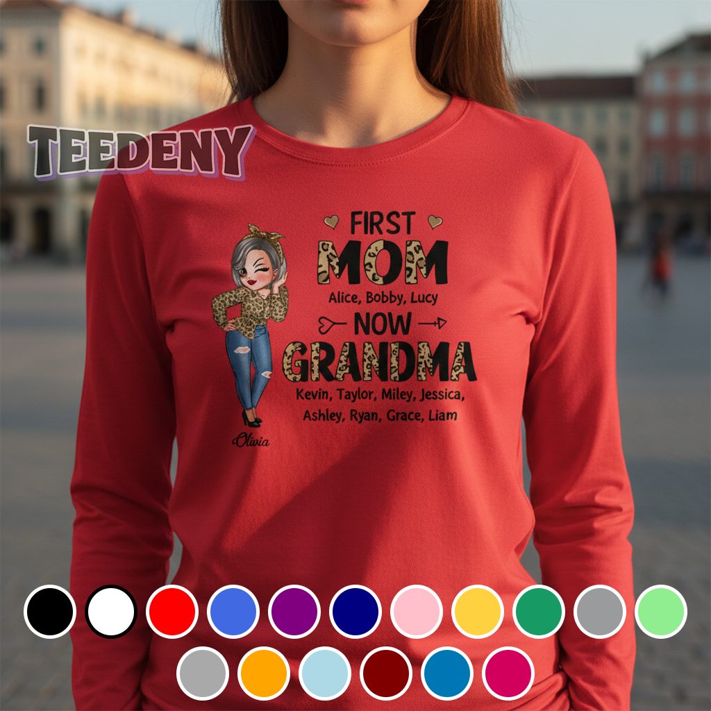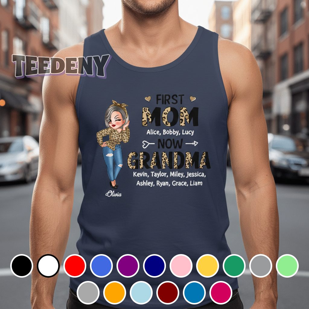 Colorful and energetic, this Personalized First Mom Now Grandma Leopard Print Shirt makes a bold statement with its playful and fun design. The shirt features a striking leopard print that swirls around the torso, creating an eye-catching backdrop for the central message. Typography takes center stage, elegantly showcasing “First Mom Now Grandma” in a contrasting shade that stands out against the animal print, enhancing its visibility. The clever interplay of hues—soft browns and vibrant yellows meld seamlessly with the distinct black spots of the leopard pattern—resulting in a garment that commands attention.
