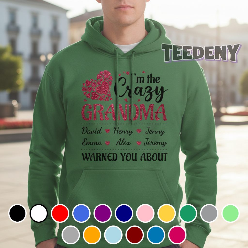 Featuring a vibrant pink base, the Personalized I am The Crazy Grandma They Warned You About Pink Glitter Shirt captures attention with its bold design. The phrase, presented in a playful typeface, is showcased prominently across the front, surrounded by a striking glitter effect that adds a sparkling dimension to the text. Accents of white and contrasting shades enhance the overall impact, ensuring the wording stands out against the lively background. The graphic elements are thoughtfully arranged to create a harmonious balance, providing a lively touch to this T-shirt that exudes both personality and charm.