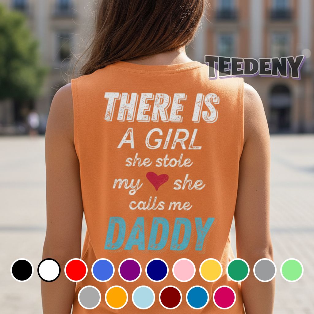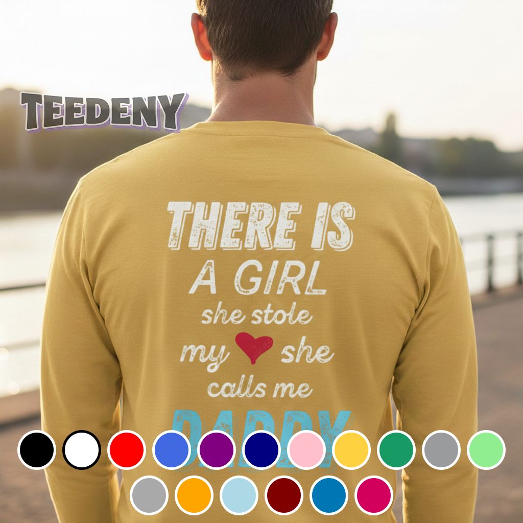 Adorning the front of the shirt is an endearing graphic that showcases the phrase “There Is A Girl Who Stole My Heart She Calls Me Daddy,” designed in a playful yet striking font. The typography intertwines seamlessly with charming heart motifs, creating a whimsical effect that captures attention. Dominated by soft pastel shades, particularly gentle pinks and soothing blues, the color palette blends harmoniously, allowing the text to stand out without overpowering the overall aesthetic. The design is thoughtfully centered, utilizing a relaxed layout that resonates with casual wear while inviting a personal connection.