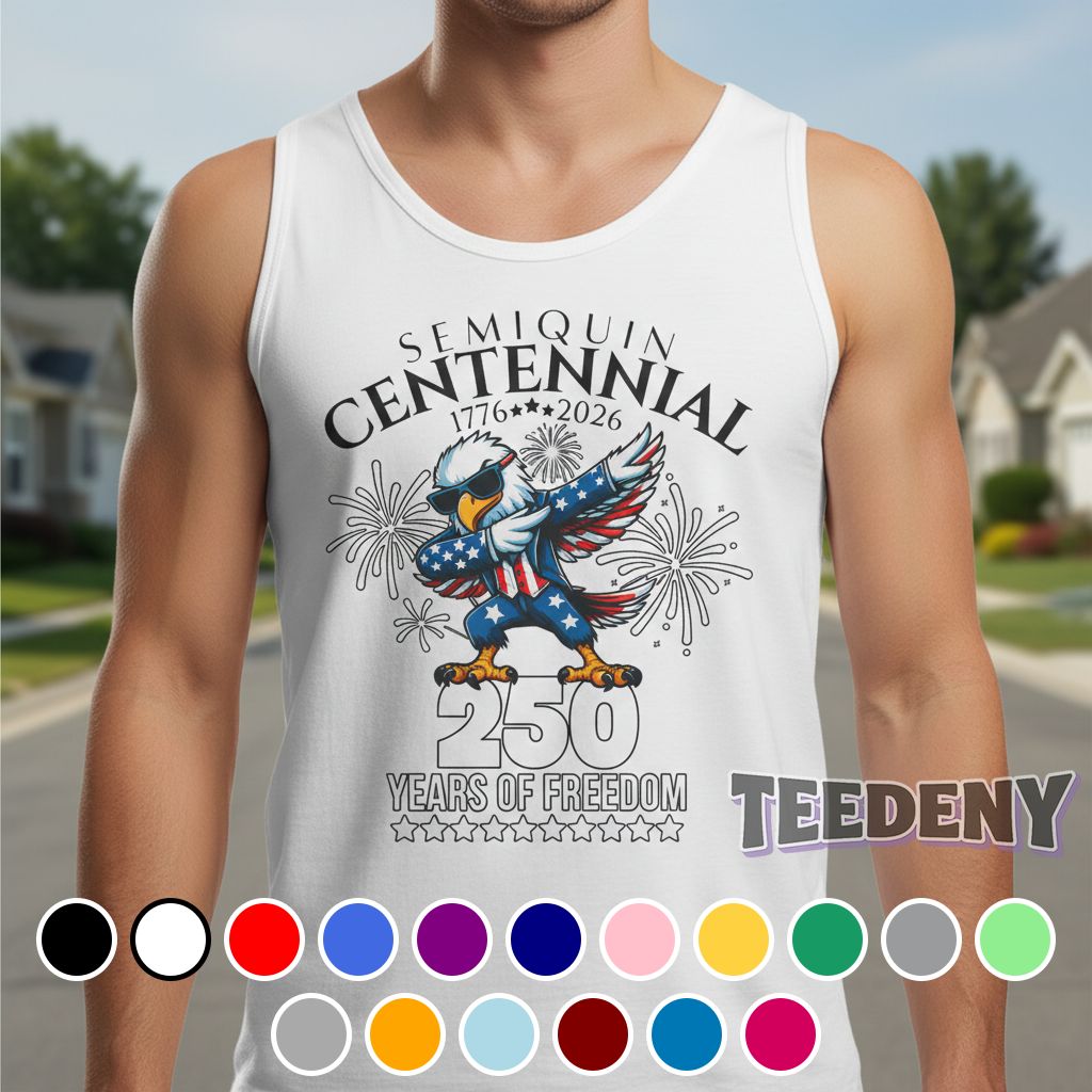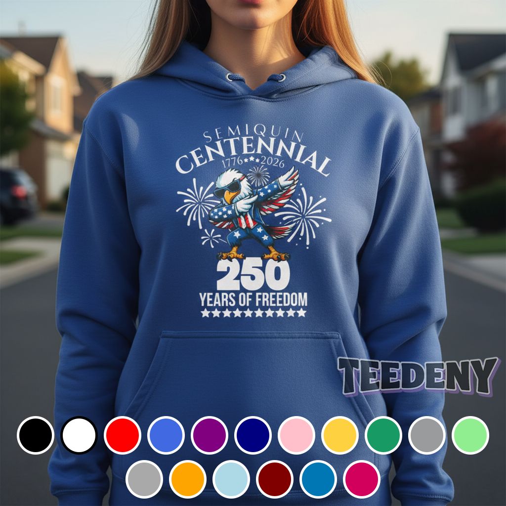 Transforming the classic T-shirt into a canvas for celebration, the US Semiquincentennial 1776 2026 Dabbing Eagle 250 Years of Freedom Shirt features a striking graphic that takes center stage. The bold eagle motif, positioned prominently against the fabric, showcases a playful dabbing pose, layered with intricate details that pop in vivid coloration. The dominant hues of deep red and navy blue evoke a sense of patriotism, while bright white accents add contrast to the overall design. Complete with a full-coverage print that seamlessly integrates the artwork across the surface, this T-shirt draws the eye and invites curiosity.