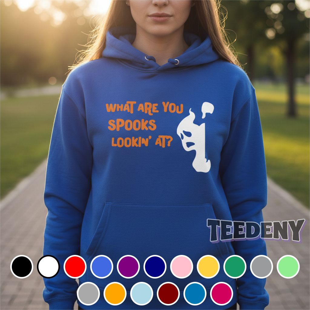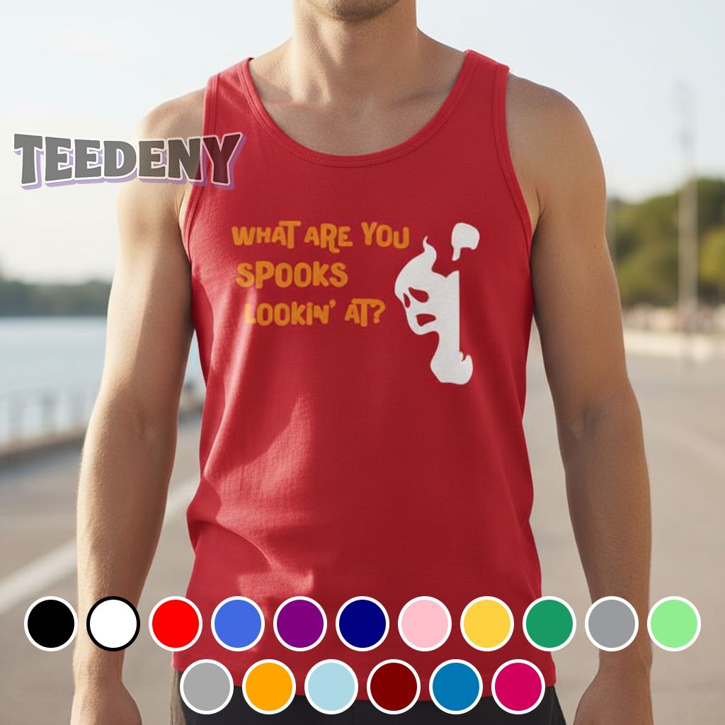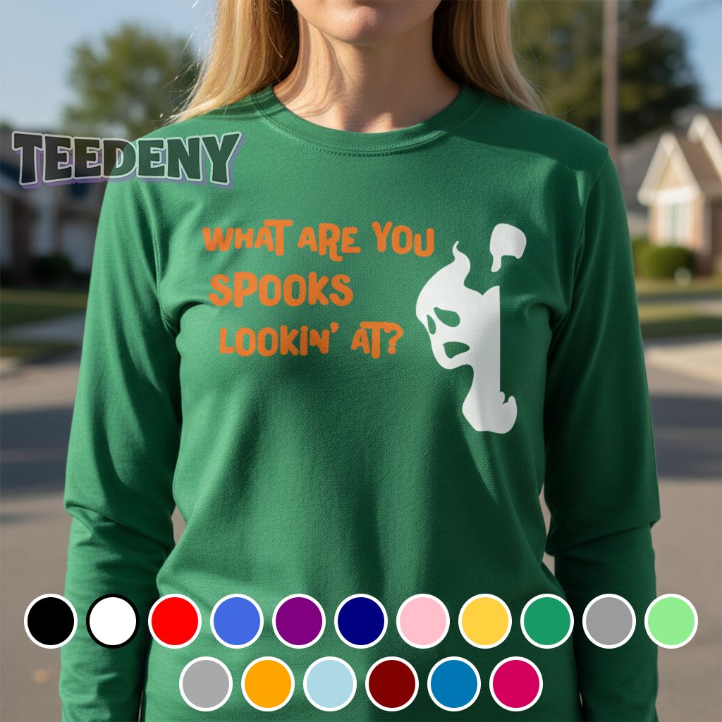 What Are You Spooks Lookin At Funny Ghost Halloween Shirt captures a playful and whimsical essence perfect for Halloween festivities. This t-shirt displays a charming ghost graphic centered on the front, with its mischievous expression and flared limbs giving it a lively appearance. The design is presented in a stark white against a deep black background, creating a striking contrast that draws the eye. Surrounding the ghost, humorous typography adds to the lighthearted tone, positioned in a playful arc above and below the figure. This combination of imagery and text is balanced and harmonious, making it a focal point while still allowing the shirt itself to remain a versatile staple.