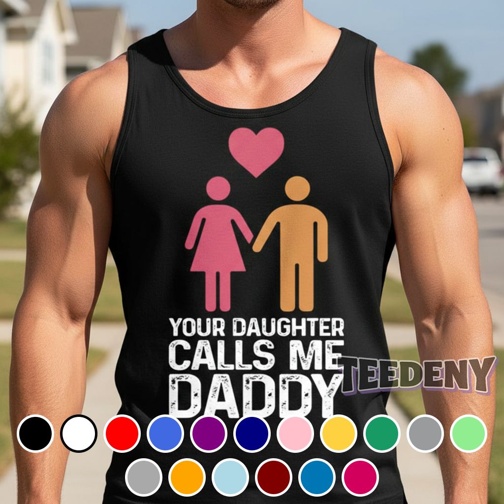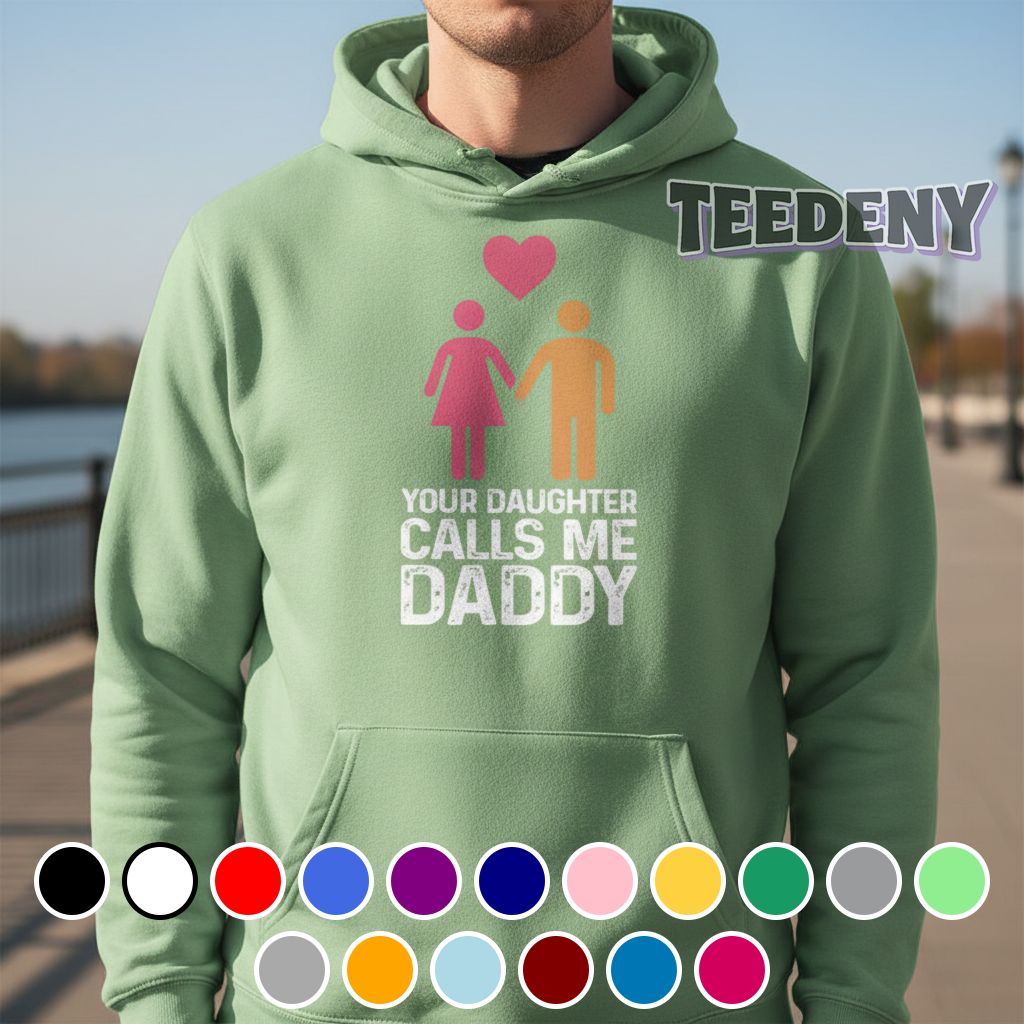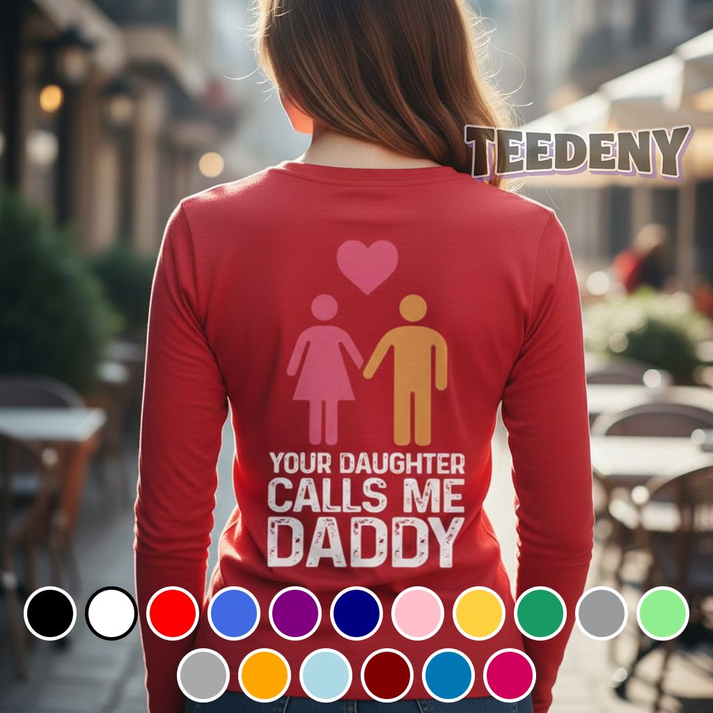 Stylishly playful, the Your Daughter Calls Me Daddy Funny Relationship Shirt showcases a charming design that exudes personality. Printed prominently across the front is a whimsical phrase, laid out in a fun, casual font that captures attention with its friendly vibe. The typography features a mix of vibrant colors, offering a lively contrast against the backdrop of the shirt, which generally boasts a classic hue like deep navy or soft gray. Intricately woven into the graphic are subtle decorative elements that enhance the overall appeal without overwhelming the simple elegance of the message.